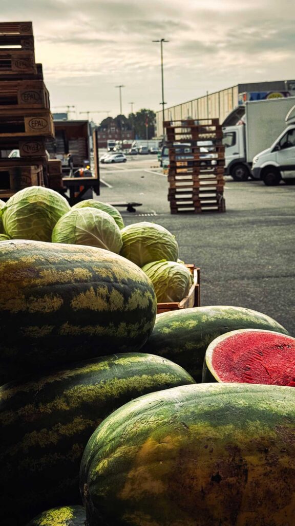 Hamburg lokasyonumuzdaki birleşik modelimizle verimliliğimiz en üst düzeye çıkarılıyor: Hamburg Limanı’ndaki 19.000 m²’lik depolama alanımızı, harici bir depoyu ve Hamburg toptancı pazarındaki merkezimizi, mal akışını en iyi şekilde birleştirmek için kullanıyoruz. Birçok müşteri, sipariş edilen markalı ürünler eş zamanlı olarak yüklenirken, hassas meyve ve sebzeleri bizzat yerinde seçiyor. Müşteri seçimi ve ortak, hızlı yüklemenin bu birleşimi, süreçleri optimize ediyor.